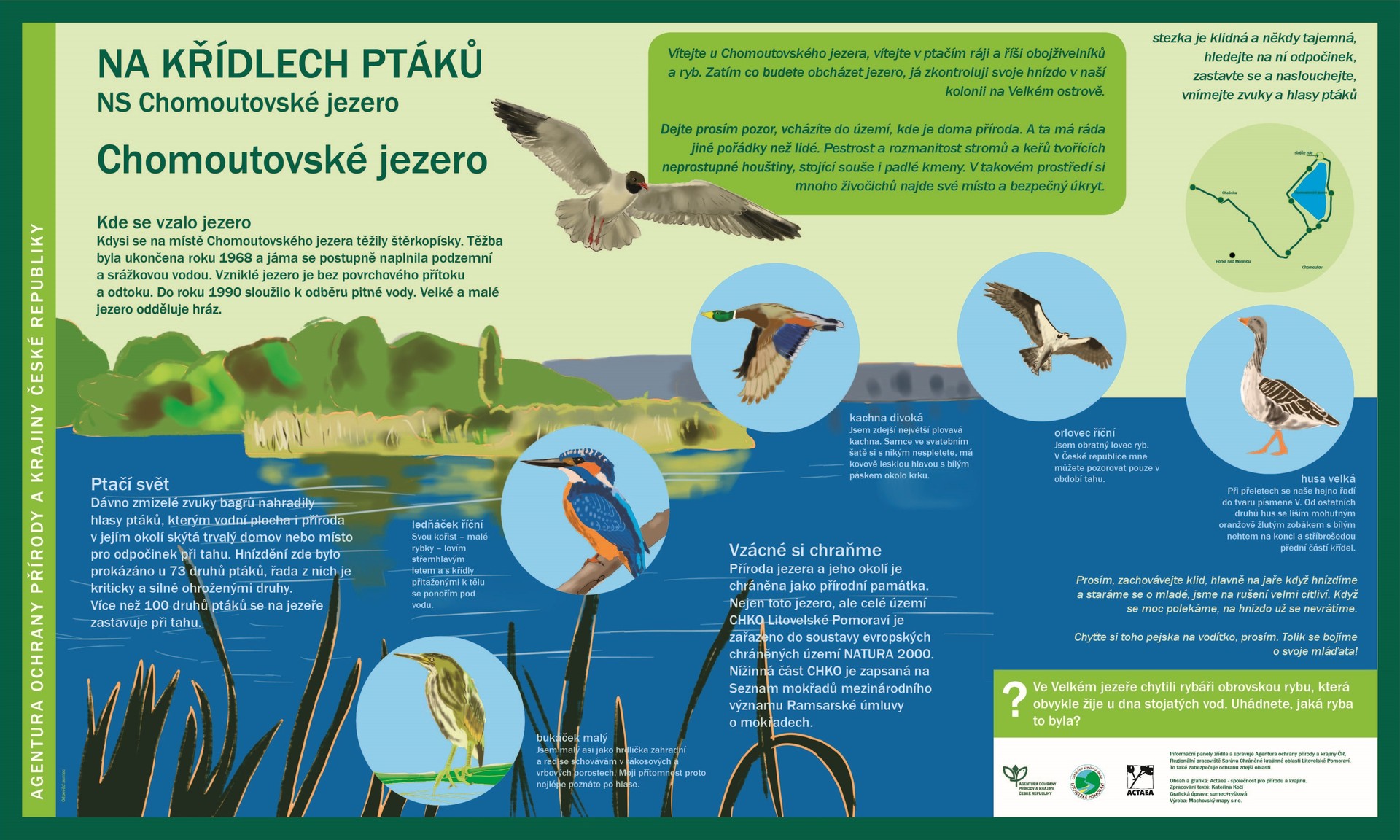 Dříve se v Chomoutovském jezeře těžil štěrk, později se z něj čerpala voda a nyní je rájem ptáků a všech vodních živočichů. Díky revitalizaci starých odkališť vznikly na jeho jižní straně rozsáhlé mokřady s mělkou vodou a rákosinami, ve kterých se daří obojživelníkům, plazům a hnízdícím ptákům. Velký ostrov uprostřed jezera každým rokem hostí početnou kolonii racků chechtavých i několik párů jejich vzácnějších příbuzných – racků černohlavých. Jejich pronikavý křik uslyšíte již zdálky, vidět je můžete z ptačí pozorovatelny, vybudované blízko parkoviště u silnice na Březce. V pozorovatelně jsou na tabuli vyobrazeni ptáci, kteří se zde vyskytují.