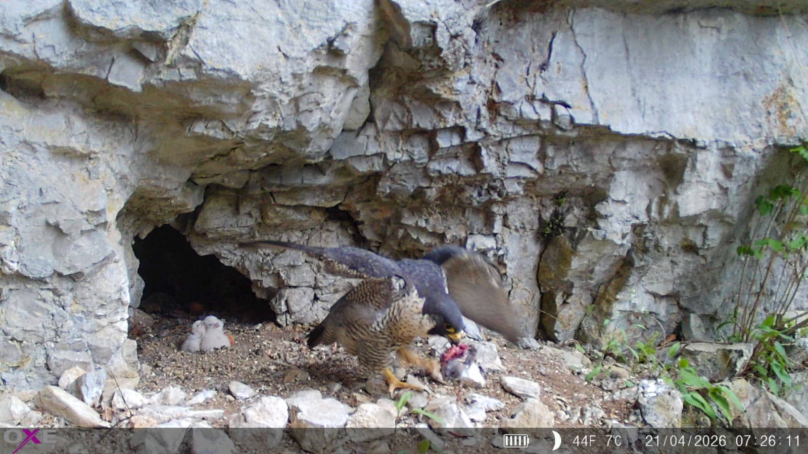 Proto jsme museli omezit průchod jeskyní i pohyb v jejím okolí. A toto opatření naštěstí funguje. Sokoli zde postupně nakladli čtyři vejce, z nichž se v těchto dnech líhnou mláďata. Situaci nám pomáhá sledovat kamera, díky níž víme, že se už vylíhla tři sokolátka, která jsou vidět na přiložených fotografiích. Aby ale měla šanci úspěšně dokončit vývoj a v polovině června hnízdo opustit, dodržujte prosím tamní pravidla a pokyny Stráže přírody, která hnízdo a jeho okolí hlídá.